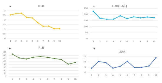 (a) indicates the decreasing trend of the NLR; (b) indicates a decrease in the PLR; (c) indicates a higher level of serum LDH at the time of initial diagnosis, which decreased after treatment; (d) indicates a significant fluctuation in the LMR.