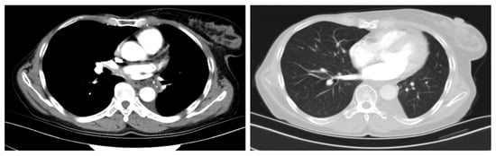 In recent years, despite the improvement in patient survival, the incidence of multiple primary malignant tumors (MPMNs) has gradually increased to 0.73–11.7% []. There is a heightened risk of developing second primary cancers in patients with primary malignant tumors compared with the general population []. In addition, MPMNs have increased malignant behavior and an overall worse prognosis []. In our case, the patient received breast surgery in 2019 and had her second primary tumor develop 2.5 years later. According to the literature, postoperative radiotherapy for early breast cancer probably increases the risk of second primary tumor development and the risk continues to increase until 15 years after surgery, particularly second primary lung cancer for whole breast radiotherapy [,,]. Therefore, patients with a previous history of breast cancer should be screened for the presence of second primary tumors.