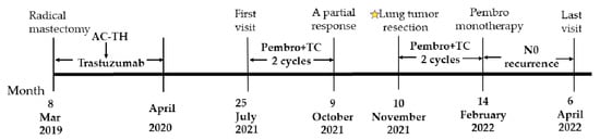 The combination therapy was well tolerated and the patient experienced grade 2 myelosuppression and grade 1 thyroid dysfunction, which were both controlled via symptomatic interventions. Adverse events were graded based on the common terminology criteria for adverse events (CTCAE-version 5.0). Considering the potential cardiotoxicity due to adjuvant chemotherapy and anti-HER2 therapy following radical breast cancer surgery, we focused on evaluating the patient’s electrocardiography (ECG), myocardial enzyme spectrum, and left ventricular ejection fraction (LVEF) and other related indicators. No cardiac adverse effects have been observed in the patient to date. The patient underwent a thoracoscopic left lower lobectomy with lymph node dissection on 10 November 2021; R0 resection was achieved with negative margins. No residual cancer cells were observed in the resected pulmonary tissue and lymph nodes during the postoperative pathological examination. Instead, chronic inflammatory tissue hyperplasia, multinucleated giant cells, a cholesterol crystal, and focal calcification were observed (Figure 3). The postoperative pathology of the patient indicated that she had a pathological complete response (pCR). The patient accepted two cycles of adjuvant chemoimmunotherapy with carboplatin/nab-paclitaxel and pembrolizumab, followed by pembrolizumab maintenance therapy. She is currently in good condition and has not exhibited any grade 3 or higher adverse reactions. A follow-up CT scan in April 2022 revealed postoperative changes, with no evidence of disease recurrence (see Figure 4). There is a treatment timeline of the patient (see Figure 5).