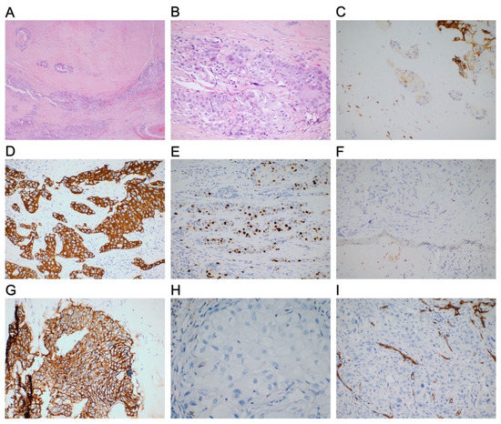 A 57-year-old Chinese female with a 2-month history of a painless mass in the left submandibular gland was admitted to the First Hospital of Jilin University in June 2020. Surgery of the left submandibular gland was performed 28 years ago to remove a PA. Computed tomography (CT) combined with a three-dimensional (3D) reconstruction of the neck soft tissue with contrast showed heterogeneous enhancement of the left submandibular gland and revealed a space-occupying lesion. Bilateral carotid sheath and submandibular and submental multiple lymph nodes were also displayed. Chest CT displayed multiple nodules in both lungs, indicating metastasis. Then, resection of the mass in the left submandibular gland, in an en bloc manner and concomitant left neck dissection, was performed. Pathological analyses showed that the carcinoma arose from the PA of the submandibular gland, and the carcinoma component was poorly differentiated as adenocarcinoma (Figure 1A,B). The tumor, 2.8 cm × 2 cm × 2 cm, was invasive, invading about 1 cm outside the envelope. Vasculature and nerves showed cancer infiltrations. The surrounding lymph nodes exhibited tumor infiltration (4/4), while the left cervical lymph node showed tumor metastasis (1/15). Immunohistochemistry (IHC) analysis revealed that the tumor cells were positive for CK5/6, CK7, CK8, CKpan, p63, and Ki-67 (30%), and they were negative for P40, CaIponin, S-100, CD34, estrogen receptor (ER), and progesterone receptor (PR) (Figure 1C–F). In addition, the tumor cells were positive (score 3+) for (human epidermal growth factor receptor) HER2/neu (clone 4B5) (Figure 1G). IHC also showed that the tumor proportion score (TPS) for PD-L1 (clone 22C3) was <1% (Figure 1H), and the combined positivity score (CPS) for PD-L1 (clone 22C3) was <1, while vascular endothelial stromal cells were positive for CD34 (Figure 1I). Pathologically, the final diagnosis was high-grade Ca ex PA. The final stage was T3N2Mx.