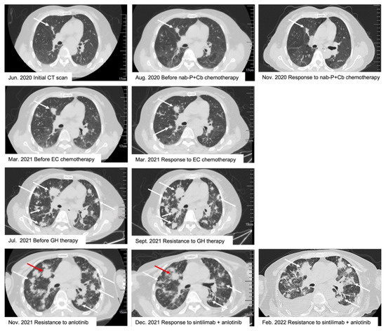 In July 2021, a repeat brain MRI revealed enlarged skull metastases and new lesions. The patient was administered gemcitabine (1.4 g IV day 1,8) plus trastuzumab (390 mg IV every 21 days). After two cycles, the CT scan showed enlarged pulmonary metastases, increased bone metastases, and new liver metastatic lesions. This patient was adjusted to oral anlotinib (12 mg/day on days 1–14, 7 days off, 21-day cycle). After 50 days, chest CT scans showed that pulmonary metastases had increased in number and size. Thus, a combination of sintilimab (200 mg IV every 21 days) and anlotinib was administered. After two cycles, the physical conditions of the patient had improved significantly. Chest CT showed that lung metastases had shrunk (Figure 2). The longest diameter of the target lesion of lung metastasis, before and after two courses of sintilimab in combination with anlotinib, was 24 mm and 18 mm (Figure 2), respectively, and the target lesion was reduced by 25%, and the efficacy was evaluated as SD, according to Response Evaluation Criteria in Solid Tumors version 1.1. Therefore, sintilimab combined with anlotinib was effective for this patient and was not associated with any significant clinical or adverse biological effects. The patient was not followed up in our department, and we found her chest CT that was reviewed on 17 February 2022 (Figure 2). Unfortunately, the chest CT scan suggested enlarged lung metastases and along with pleural effusion, suggesting disease progression with a progression-free survival of 3.5 months. This case suggests that immunotherapy combined with antiangiogenic therapy was effective for this patient in the short term, but we need to accumulate more cases to verify the effectiveness of this combination regimen. Figure 2 shows chest CT scan images of the patient in the clinical process.
