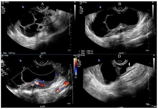 Ultrasonic features of the mass. (A) A multilocular solid-cystic mass with a clear boundary was seen in the left adnexal area, in which lipid and hair-like hyper-echo mass was also observed. (B) Calcification can be seen in solid hypo-echo of the mass. (C) The CDFI revealed scattered, short strips of blood flow signals in the solid proportion of this mass. (D) Implant nodules can be seen on the intestinal surface.