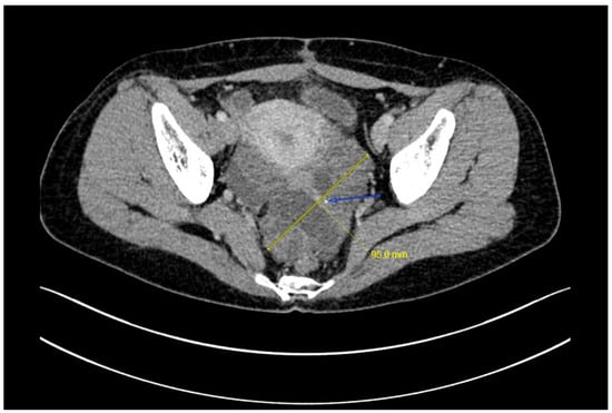 A right ovarian immature teratoma, grade 2, stage IC2 was diagnosed based on the FIGO stage classification for ovarian tumors. A chemotherapy regimen including bleomycin, etoposide, and cisplatin (BEP) was given for three cycles based on the NCCN clinical guidelines for ovarian germ cell tumors. AFP levels quickly decreased from 27.8 ng/mL to normal after two cycles of chemotherapy, and the last cycle was completed in mid-March 2022. The serum CA19-9 was less than 2 U/mL before surgery. Repeat ultrasonography conducted one month after the surgery did not show any abnormalities, but an ultrasound examination on five days after the last cycle of chemotherapy showed an approximately 8-cm solid cystic mass located in the left posterior uterus. The patient was then referred to our hospital. A repeat blood draw showed that serum AFP, CA125, NSE, and CA19-9 were all within normal ranges. Recurrence of immature teratoma and progressive disease could not be excluded. Further ultrasonography conducted by an expert demonstrated an 8.0 × 7.3 cm mixed-echo, lobulated mass with clear boundaries in the left adnexal area. The presence of lipid and hair-like echo, as well as a CDFI that revealed only scattered, short strips of blood flow signals in a small portion of the mass, were suggestive of GTS (Figure 2). Enhanced abdominal-pelvic CT was also used to determine the diagnosis and showed a comparable result to the ultrasound (i.e., a solid 8-cm cystic mass with undetermined malignancy), and no enlarged retroperitoneal lymph node was observed (Figure 3).