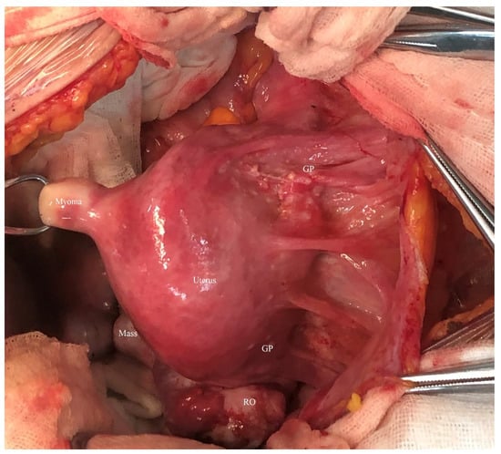 Intraoperative views during exploratory laparotomy demonstrated a small myoma located at the posterior uterine wall, and multiple glial tissue (“GP”) seeding was noted at the uterine surface, vesical peritoneal reflection. The mass was located in the pouch of Douglas, with most proportion obscured by the uterus (RO, right ovary).