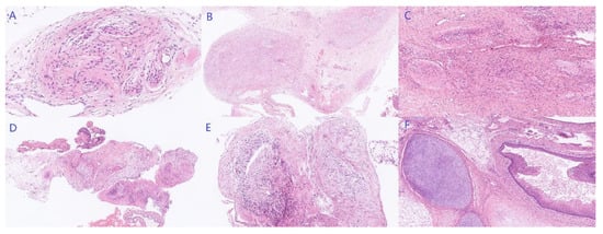 Pathology results of peritoneal seeding of GP and GTS (HE staining). Mature neuroglia presented with distinctive rounded, or ovoid nodules with well-defined boundaries involving omentum majus ((A), 200×), vesical peritoneal reflection ((B), 25×), peritoneum of ascending colon ((C), 50×), right ovarian cyst ((D), 50×), and posterior uterine wall ((E), 50×), while mature cartilage and squamous epithelium differentiation were observed in the mass ((F), 50×).