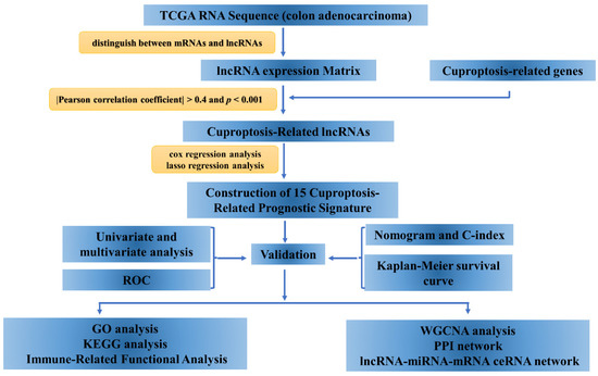 LncRNAs are defined as RNA transcripts greater than 200 nucleotides that do not encode proteins. They play a key role in various cellular processes in the cancer disease process [11,12,13]. Numerous studies have shown that lncRNAs can be involved in colon adenocarcinoma progression and immunotherapy through various pathways, such as m6A [14], ferroptosis [15], necroptosis [16], and autophagy [17]. In contrast, the value of the cuproptosis-related lncRNA prognostic model in colon adenocarcinoma has not received attention.