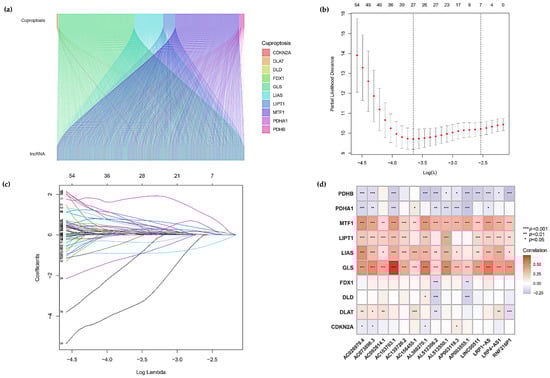 Screening for Prognostic lncRNA Signature. (a) Co-expression analysis of lncRNAs associated with cuproptosis-related genes in COAD. (b,c) The least absolute shrinkage and selection operator (LASSO) regression was performed with the minimum criteria. (d) Correlation analysis of 15 signature lncRNAs with 10 cuproptosis-related genes (horizontal coordinates are lncRNAs involved in model construction, blue represents negative correlation, red represents positive correlation).
