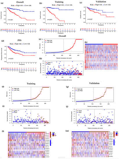 Further analysis revealed that the survival curves obtained from the overall, training and validation groups based on the prognostic risk model constructed with 15 lncRNAs showed that the overall survival (OS) was lower in the high-risk subgroup compared with the low-risk subgroup, and the difference between the two groups was statistically significant (p < 0.05, Figure 3a–c), which also indicated that our constructed model could distinguish patients in the high-risk and low-risk subgroups. Furthermore, progression-free survival (PFS) in the overall group revealed that PFS appeared lower in the high-risk subgroup compared with the low-risk subgroup, with a significant difference between them (p < 0.001, Figure 3d). The distribution of risk scores and survival status also showed that the higher risk scores were associated with more deaths among COAD patients in the overall, training and validation groups (Figure 3e–j). Meanwhile, we found that high expression of lncRNAs (AP003119.3, RNF216P1, AC156455.1, AL360270.1, AP003555.1, AL513550.1) was associated with increased risk in COAD patients, indicating that these lncRNAs are high-risk lncRNAs. Additionally, their high expression corresponds to shorter OS. In addition, with increasing patient risk, AC073896.3, LINC00511, AC026979.4, AC103703.1, LRP1-AS was down-regulated in expression, indicating that it is a low-risk lncRNA (Figure 3k–m).