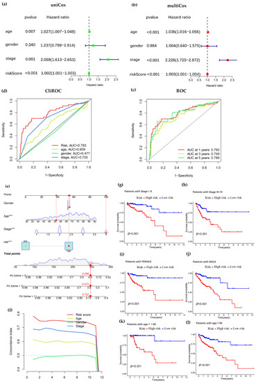 Validation of a prognostic model of cuproptosis-related lncRNA. (a,b) Univariate and multivariate analysis of clinic pathological factors of overall survival in COAD patients. (c) Comparison of receiver operating characteristic (ROC) curves for risk score models to predict 1-, 3-, and 5-year overall survival (OS). (The horizontal coordinate is the false-positive rate and the vertical coordinate represents the true-positive rate. The larger the area under the curve of the ROC curve, the higher the accuracy of the model’s prediction). (d) Comparison of ROC curves for risk score and other clinical factors (the risk score had the largest area under the curve, indicating that the constructed model was a better predictor of prognosis than other clinical characteristics in COAD patients). (e) Nomogram with risk score model and clinicopathological features (“***” indicates p < 0.001). (f) C-index curve combining risk score, stage, age and gender (The consistency index of the risk score was much greater than other clinical factors, and the risk score was more accurate in predicting survival in patients with COAD). (g,h) Different clinical stages of COAD were introduced for model validation (significant differences between high and low risk subgroups for stages I–II and III–IV of COAD, p < 0.001). (i,j) Kaplan–Meier survival curve with gender as an indicator (female vs. male). (k,l) Kaplan–Meier survival curve with age as an indicator (>60 years old vs. ≤60 years old).