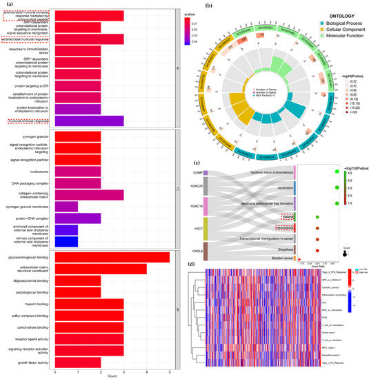 KEGG analysis and immune-related functional analysis. (a,b) GO enrichment analysis of risk differential genes. (c) KEGG analysis of risk differential genes. (d) Analysis of immune-related functions in high-risk and low-risk subgroups (* p < 0.05).