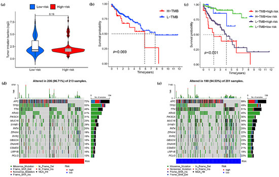 Correlations between the risk score model and somatic variants. (a) Differential analysis of tumor mutational burden (TMB) between high and low risk subgroups for colon adenocarcinoma. (b) Correlation between the prognosis and TMB in COAD patients. (c) Predictive power of risk model in high and low TMB groups. (d,e) Compare the mutation rates of reported prognosis-associated genes in low- and high-risk groups.