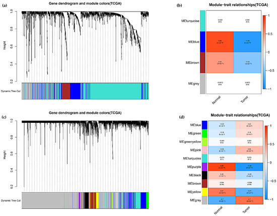 Screening for modules significantly associated with colon adenocarcinoma by WGCNA. (a) Hierarchical cluster analysis of the identified lncRNAs was performed to detect co-expression clusters with corresponding color assignments. (b) Correlation analysis of clinical features of colon adenocarcinoma with Eigengene of lncRNAs, where MEblue had the highest correlation coefficient. (c) Hierarchical clustering analysis of the identified mRNAs. (d) Correlation analysis of clinical features of colon adenocarcinoma with Eigengene of mRNAs, where MEpurple had the highest correlation coefficient.
