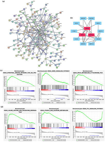 Construction of protein–protein interaction (PPI) network and gene set enrichment analysis. (a) PPI network was constructed with 325 targeting mRNAs. (b) PPI network of 13 genes were obtained by Cytoscape, among which YWHAG, KRAS, MAP2K4 were core genes. (c,d) Potential signaling pathways for targeting mRNAs revealed by GSEA analysis.