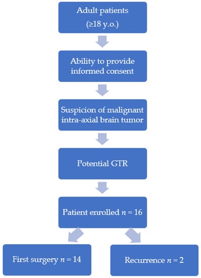 - Wykes, V.; Zisakis, A.; Irimia, M.; Ughratdar, I.; Sawlani, V.; Watts, C. Importance and Evidence of Extent of Resection in Glioblastoma. J. Neurol. Surg. Part A Cent. Eur. Neurosurg. 2021, 82, 75–86. [Google Scholar] [CrossRef]