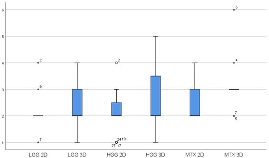 | 25th | 50th (Median) | 75th | HGG 2D-LGG 2D | MTX 2D-HGG 2D | MTX 2D-LGG 2D | ||||||