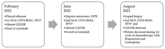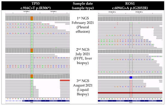 The TP53 mutation (Figure 2) and the CD74-ROS1 translocation were detected in all three analyses by HC-NGS, providing evidence for the stability of the driver mutation. The other tumor sites (lymph nodes, lung, pleura) were in stable remission. The quality criteria for the clinically relevant regions were met [24,25]. The G2032R was not detected in the liver metastasis, which was the fastest progressing tumor site at first relapse (2nd NGS); however, it was detected in the plasma (3rd NGS) when the patient progressed on lorlatinib with the leading site again being the liver (Figure 2). Although it cannot be formally ruled out that the G2032R mutation may have stemmed from a different tumor site than the liver, it is highly improbable given the high allelic frequency of 11% at the second relapse. Since no supporting read of the G2032R was detected in the second NGS from the liver biopsy, the mutation most probably developed during therapeutic pressure of lorlatinib and became detecTable 6 weeks later at the time of liquid biopsy.