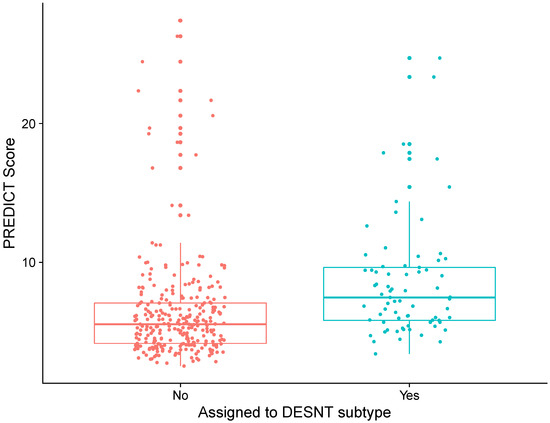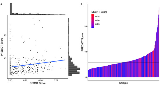 DESNT scores from our combined dataset had a median value of 0.09 and an interquartile range of 0.32. PREDICT scores had a median value of 5.84 and an interquartile range of 3.24. There was a weak correlation between DESNT score and PREDICT score (Figure 1A; rho = 0.21; p < 0.05; Spearmen’s correlation). The DESNT score is very variable with respect to the PREDICT score (Figure 1B). The PREDICT score showed a statistically significant increase in samples that were DESNT cancers, i.e., where the proportion assigned to the DESNT subtype was higher than all other subtypes in the framework (Figure 2; p < 0.001; Mann–Whitney U test; difference in medians = 1.93).