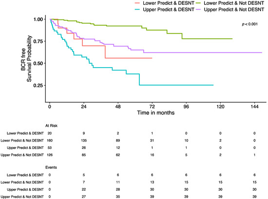Kaplan–Meier plot showing the survival curves for samples grouped by DESNT and Prostate PREDICT model status. Endpoint is time to biochemical recurrence (BCR). Samples are divided into DESNT vs. non-DESNT and upper PREDICT vs. lower PREDICT (split around the median PREDICT score). The “At Risk” table below the plot shows the number of patients in each group, at the corresponding time point, that have not had a biochemical recurrence event and have longer follow up than that time. The “Events” table shows the cumulative number of biochemical recurrence events observed in a group at that time point.