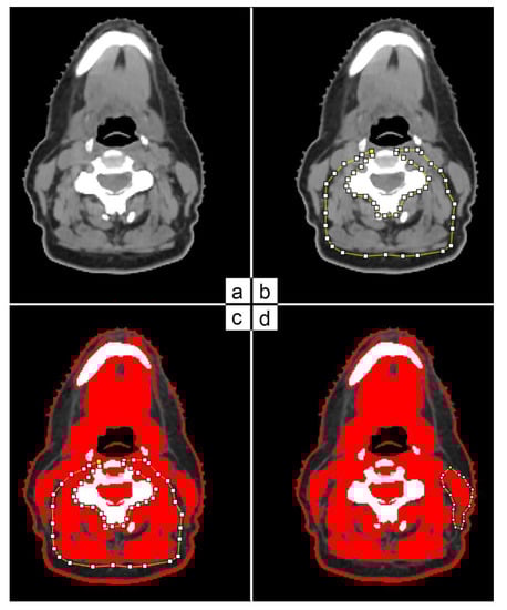Cross-section area (CSA) was measured using a single slice at the level of C3 vertebra on patients’ t0 and t3 CT scans. The selected slice had to show the vertebral transverse process and the entire vertebral arc (Figure 1a). A resident radiation oncologist and an experienced radiation oncologist performed the muscle area delineation and analysis using ImageJ software (Figure 1b). Skeletal muscle area was defined as the pixel area between the radiodensity range of −29 and +150 Hounsfield units (HUs), encompassing muscles from very low and low density (−29 to +34 HU) to normal density (+35 to +150 HU) [17,18]. In the case of C3 paravertebral muscle areas (Figure 1c), the contralateral sternocleidomastoid (SCM) muscles were delineated (Figure 1d).