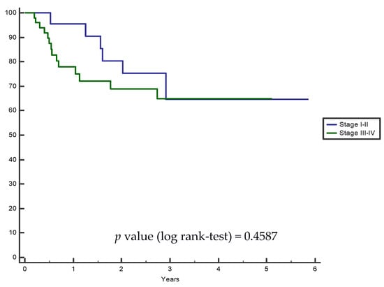 Median follow-up was 22 months (range: 3–70 months). Kaplan–Meier progression-free survival analysis was performed in grouped stages (stage I–II vs. III–IV) and the log-rank test was not significant (Figure 2). Twenty patients experienced disease relapse (nine with disease progression with lung, hepatic or bone metastases, and eleven local relapses).