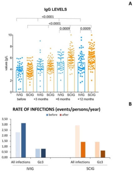 The primary objective was to compare the rate of bacterial or mycotic (proven or probable) infections of any grade before and after treatment with SCIG or IVIG. Secondary objectives were to compare between SCIG and IVIG the levels of serum IgG, IgA e IgM immunoglobulins after 3–6–12 months of therapy and/or at the last available follow-up; cumulative incidence of infections; the annual incidence of all grade infections and those graded as ≥3; rate and type of adverse events during IGRT; rates and causes of therapy discontinuation; the switch rate of IGRT type (i.e., from IVIG to SCIG and from SCIG to IVIG); bruising and bleeding in patients co-treated with ibrutinib (drugs approved for the treatment of chronic lymphocytic leukemia and associated with minor bleeding) [2,4]. Among patients who received SCIG we will perform the above-mentioned analysis comparing different subcutaneous drugs (i.e.g., 16% vs. 20% immunoglobulins concentrations).