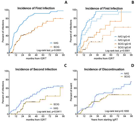 Cumulative incidence of infections and discontinuation. The upper panel on the left (A) shows the Kaplan–Meier curves of time to first infection in patients treated with intravenous immunoglobulins (IVIG) or subcutaneous immunoglobulin (SCIG). The upper panel on the right (B) shows the Kaplan–Meier curves of time to first infection in patients IVIG or SCIG, according to serum IgG levels. Patients achieving at least 6 g/L of IgG display a longer time to the first infection. In the lower-left panel (C) is shown the Kaplan–Meier curves of time to second infection in patients treated with IVIG or SCIG. In the lower-right panel (D) is shown the Kaplan–Meier of the cumulative incidence of discontinuation in patients treated with IVIG or SCIG. Log-rank test was used to compared survival curves.