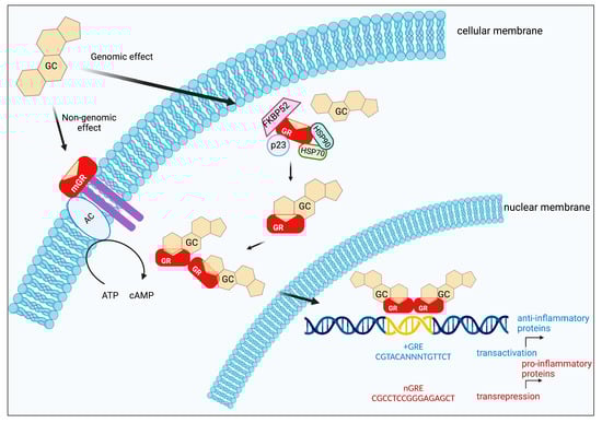 The genomic mechanism of action of GC is given by binding the ligand to its GR located in the cytoplasm in an inactive conformation bound to multiple protein complexes that include heat shock proteins such as Hsp90, Hsp70, immunophilin p59, phosphoprotein p23, and cytokines [,].
