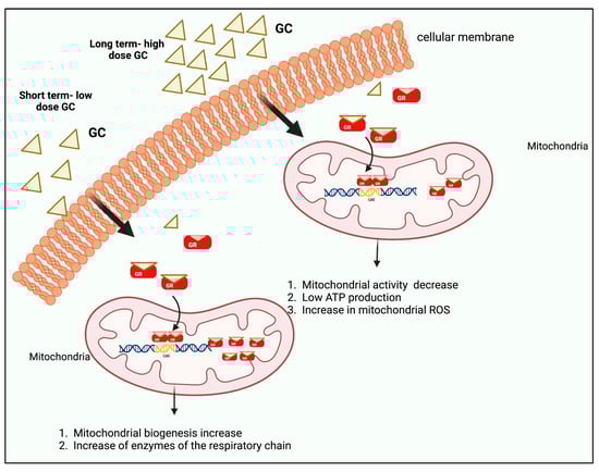 The effects of GCs on mitochondria depend on the dose and time of exposure. GC has generally been detected in different cell types where GC increases mitochondrial biogenesis at low doses or in short exposure times with increases in respiratory chain enzymes [,]. In contrast, at high concentrations and/or prolonged times, they cause a decrease in mitochondrial activity and also in membrane potential, causing low ATP production and an increase in reactive oxygen species (ROS) [].