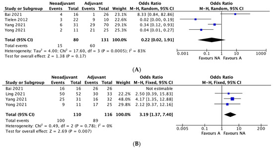 Four studies reported overall 5-year survival rates between the two groups. The 5-year survival rate was 90.9% in the neoadjuvant group and 76.7% in the adjuvant group. A meta-analysis of the included studies using an M-H fixed effects model showed a significant difference between the two groups in terms of overall 5-year survival rates, in favour of neoadjuvant therapy (OR 3.19, 95% CI, 1.37–7.40, * p = 0.007), with no heterogeneity between studies (I2 = 0%). (Figure 1B).