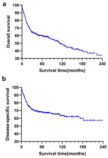 The clinicopathological and prognostic data were collected from the SEER database and extracted by SEER*Stat 8.3.8 software (http://seer.cancer.gov/seerstat/, accessed on 30 April 2021). The SEER database is the most representative large-scale cancer registry database in North America, which include 18 cancer registries’ clinical data and covers 34.6% of the U.S. population [], and with the characteristics of relatively complete follow-up information and large sample size. The cancer information released by the SEER database is allowed to be reported publicly; therefore, the Ethics Committee of the First Affiliated Hospital of Xi’an Jiaotong University exempted the review of this study.