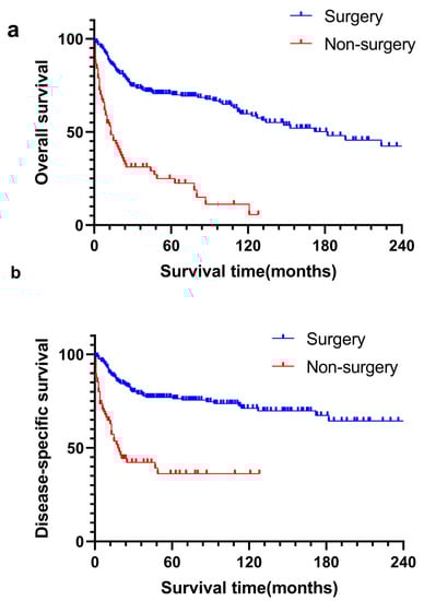 The overall survival (OS, (a), p < 0.001) and disease-specific survival (DSS, (b), p < 0.001) analyses for primary bile duct and ampullary neuroendocrine neoplasms patients in surgery and non-surgery subgroups.