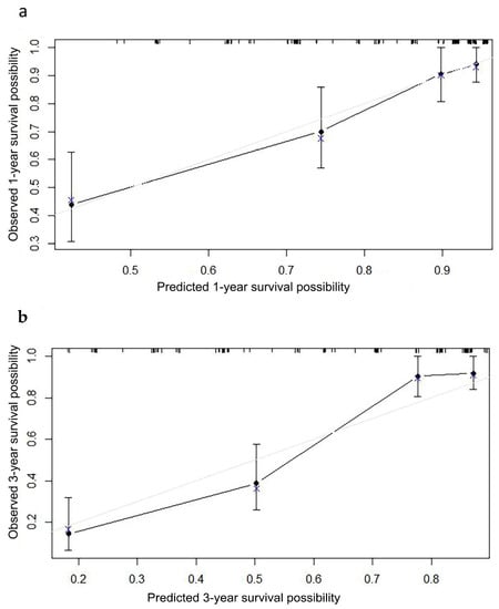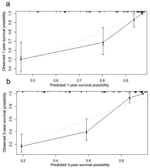 The 1000 bootstrap resampling internal verification correction for the nomogram of (a) 1-year overall survival, (b) 3-year overall survival in primary bile duct and ampullary neuroendocrine neoplasms patients.