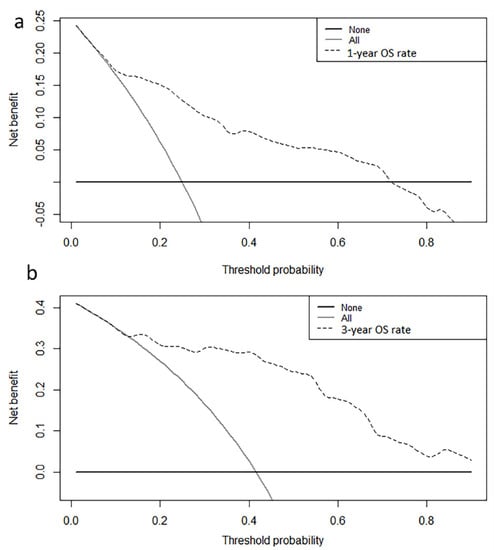 The decision curve analysis of the (a) 1-year overall survival rates, (b) 3-year overall survival rates for the training and validation cohorts.