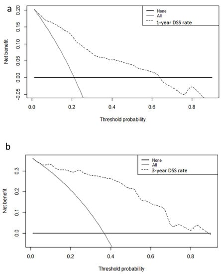 The decision curve analysis of the (a) 1-year disease-specific survival rates, (b) 3-year disease-specific survival rates for the training and validation cohorts.