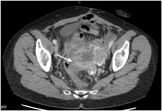 Images from 58-year-old patient with carcinosarcoma of the ovary and recurrence in the rare form of giant cell carcinoma. The fistula between tumor and rectum (arrow), CT post-contrast image in venous phase obtained in the axial plane, shows pelvic tumor and adjacent intestine, fatty tissue between the tumor and intestine vanished as indirect sign of the fistula.