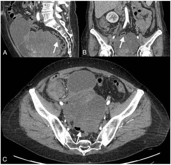 Images of a 54-year-old patient with an ovarian cancer recurrence in the form of the fistula between the tumor and rectum. CT obtained in the coronal (A), sagittal (B), and axial plane (C) shows large pelvic tumor with adjacent rectum.