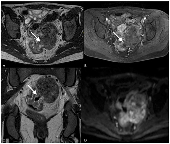 Images of a 67-year-old woman with a recurrent high grade serous ovarian cancer. MRI T1-weighted post-contrast image obtained in the axial plane (A), coronal plane (B), sagital plane (C), and T1-weighted image post-contrast (D) show large pelvic tumor and fistula (arrows) between the tumor and sigmoid colon.