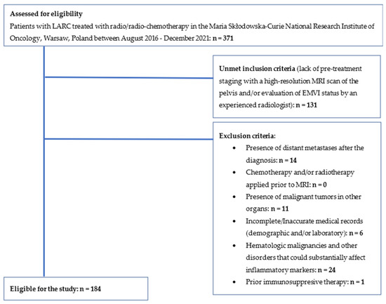 A retrospective analysis of a database of 371 patients with LARC treated in the Maria Skłodowska-Curie National Research Institute of Oncology, Warsaw, Poland between August 2016 and December 2021 was performed. The inclusion criteria were as follows: (1) patients were diagnosed with primary locally advanced rectal cancer (T3-T4, N0-N2, M0) confirmed by histopathology. TNM stage was assessed according to the American Joint Committee on Cancer TNM staging standard, 8th edition; (2) pre-treatment staging with a high-resolution MRI scan of the pelvis and evaluation of EMVI status by an experienced radiologist was performed; (3) performance status of the patients was ECOG 0–2, patients were qualified to receive radio/chemo-radiotherapy by multidisciplinary team; (4) clinical records including demographic and laboratory data were available and complete. The exclusion criteria were: (1) presence of distant metastases after the diagnosis; (2) chemotherapy and/or radiotherapy applied prior to MRI; (3) presence of malignant tumors in other organs; (4) presence of hematologic malignancies and disorders that could substantially affect inflammatory markers; (5) prior immunosuppressive therapy. One hundred eighty-seven patients were excluded from the study due to unmet inclusion criteria or the presence of exclusion criteria. One hundred eighty-four were found eligible for the study as shown in Figure 1.