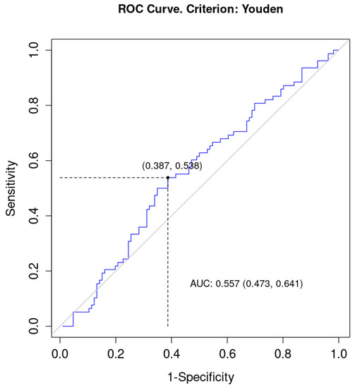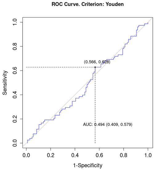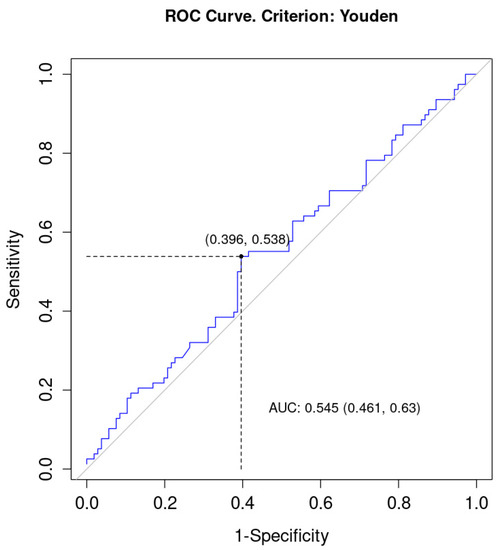 The AUC for PLR was also higher than 0.50 and equaled 0.55 (95% CI = 0.46; 0.63), which meant that PLR was a weak discriminator of the status of EMVI. The sensitivity for this variable was 0.54, and 1-specificity equaled 0.40. The optimal cut-off point in this model was 162.71, Figure 6.