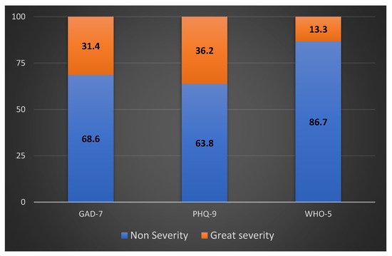 Frequency distribution (%) of GAD-7, PHQ-9, and WHO-5 scores among enrolled participants. “Non-severity” includes scores within normal limits. “Great severity” includes scores at pathological limits, regardless of severity grade.