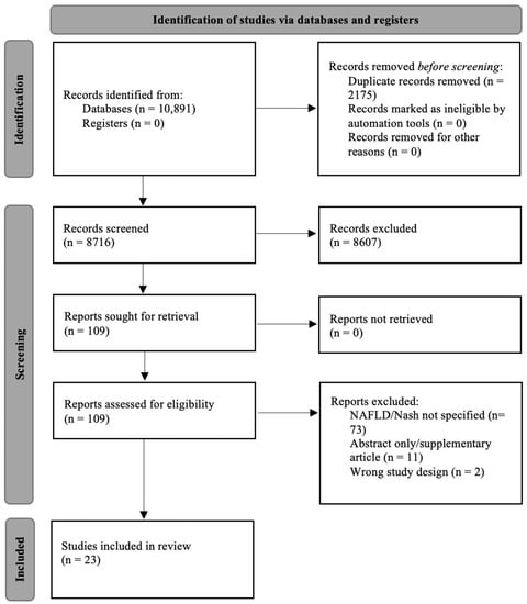 The literature search process is shown in Figure 1. The search identified a total of 10,891 articles from the databases. Duplicates (n = 2175) were removed, and the remaining 8716 records were identified for title and abstract screening. Among these, 8607 articles were deemed ineligible as a result of title or abstract screening. One hundred and nine studies from the search were eligible for full-text screening, and 86 were excluded for the following reasons: NAFLD or NASH not specified as an outcome (n = 73), abstract only/supplementary articles (n = 11) and wrong study design (n = 2). Therefore, 23 studies were included in this systematic review.