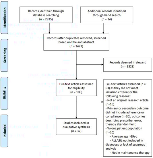 Inclusion criteria for this review were as follows: (1) children, adolescent, and young adults (0–39 years old) with acute lymphoblastic leukemia/lymphoma in remission, on oral maintenance chemotherapy, (2) original full-text research articles, (3) medication adherence or nonadherence as the primary or secondary outcome. Adherence, in this review, was defined as the consistency with which individual patients took prescribed medication. Exclusion criteria included (1) mean or median age of participants greater than 39 years old, (2) focus on non-maintenance phase of therapy, (3) inclusion of multiple malignancies without subgroup analysis of ALL/LBL, (4) focus on prescriber error or abandonment of therapy, and (5) no full-text article available.