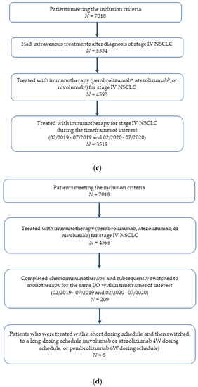 Figure 1a–d show the study attrition overall (Figure 1a) and for each cohort (Figure 1b–d). A total of 7018 patients were selected who had been diagnosed with stage IV NSCLC, and three cohorts were selected from those patients. The cohort of patients with newly diagnosed stage IV NSCLC (N = 2579) had received a new diagnosis of stage IV NSCLC during either the pre-COVID-19 study period (February–July 2019) or the during- COVID-19 study period (February–July 2020) (Figure 1b). Another cohort of patients (N = 3519) had initiated or received at least one administration of an immunotherapy (i.e., pembrolizumab, nivolumab, atezolizumab) during either the pre-COVID or the during-COVID study period (Figure 1c). As for the final cohort of patients, 209 patients had completed chemoimmunotherapy and subsequently switched to monotherapy for the same I/O within the timeframes of interest (February–July 2019 and February–July 2020). Among these 209 patients, 8 were previously treated with a shorter dosing schedule and then switched to a long dosing schedule. All of those patients were captured during the February–July 2020 time period and treated with pembrolizumab (Figure 1d). These patients were designated as the switchers cohort.