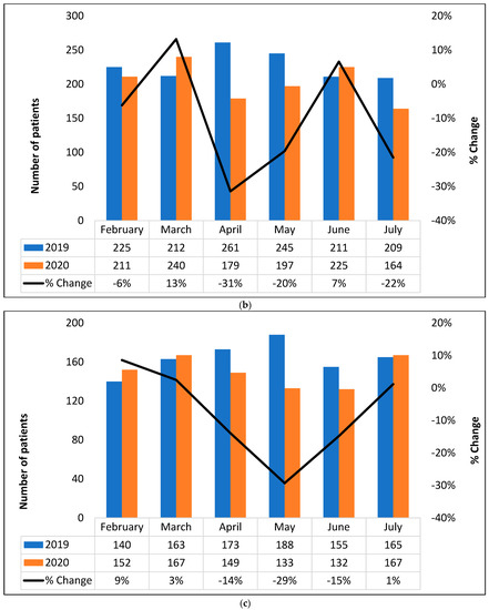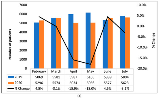 The point-in-time comparison of monthly trend was performed. Percent change between each month was calculated by subtracting the patient count in 2019 from the same month in 2020 and dividing that by the patient count in 2019.