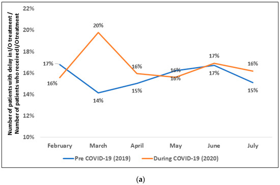 While there was a 3% decrease (17% to 14%) in patients with a delay in I/O treatment from February to March 2019 (pre-COVID-19 timeframe), there was a 4% increase (16–20%) from February to March 2020 (during-COVID-19 timeframe) (Figure 3a). Additionally, from February 2020 to March 2020, the number of patients with delay in I/O treatment increased by 31% (from 190 in February to 249 in March). When comparing month by month, 20% of patients had a delay in I/O treatment in March 2020 vs. 14% in March 2019, an increase of 6%. After May of both years, however, the differences between the pre-COVID-19 and during-COVID-19 percentages were less marked.