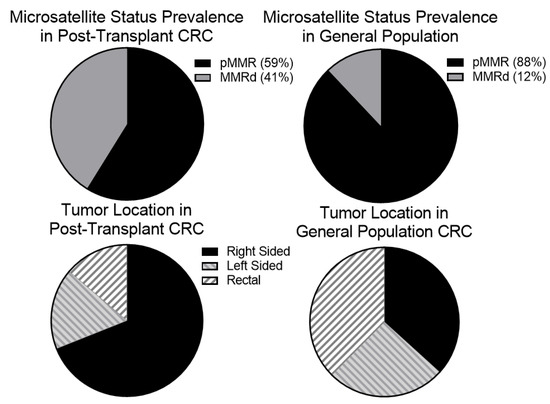 To our knowledge, this investigation of CRC in solid organ transplant recipients is the first to describe the molecular profile of some of these cancers and provides valuable insight into the potential roles that immunosuppression may play in CRC development. We report on 29 patients treated at JHHS who developed CRC after solid organ transplant. Similar to previous reports, we observed a higher proportion of proximal colon cancers in post-transplantation colon cancer compared to non-transplant CRC patients [15,16]. Right-sided disease has previously been shown to be associated with higher rates of tumor immune infiltration, MMRd disease (19.2%), and PIK3CA mutations (18.4%) all of which were noted to be enriched in our post-transplant CRC population [17,18].