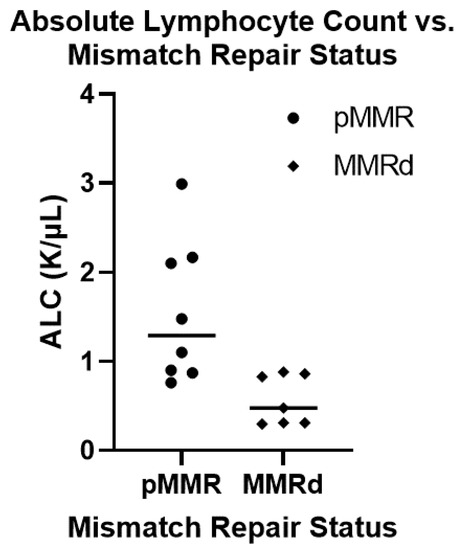 Comparing the absolute lymphocyte count between mismatch proficient and deficient colorectal cancer in transplant population. A total of 15 patients within our cohort had absolute lymphocyte counts (ALC) carried out at the time of their diagnosis along with mismatch repair status determination and tumor mutation burden. Of these, 8 patients were mismatch repair proficient (pMMR) and the other 7 patients were mismatch repair deficient (MMRd). The pMMR tumors had a higher ALC (median: 1.20, mean: 1.55) then the MMRd tumors (median: 0.48, mean: 0.57) which was statistically significant (student’s t-test: p-value = 0.009).