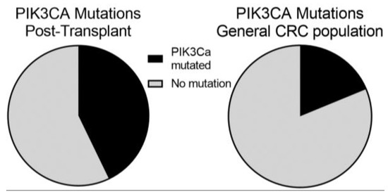 The distribution of PI3 Kinase-mTOR Mutations in Post-transplant and General Populations diagnosed with Colorectal Cancer (CRC). We identified 14 patients in our post-transplant population who had molecular profiling. Of them, 6 (44%; 95% CI, 18–71%) had PIK3CA which is significantly increased by Fisher’s exact test (p = 0.042) compared to a 24% prevalence in a general CRC population.