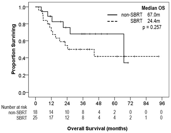 Patients were followed-up for a median of 23.7 months. At the time of analysis, 44% of patients had died. The median overall survival (OS) was of 67.0 months for the entire study cohort. The median OS was of 24.4 months in the SBRT cohort and of 67.0 months in the non-SBRT, curative-intent cohort.