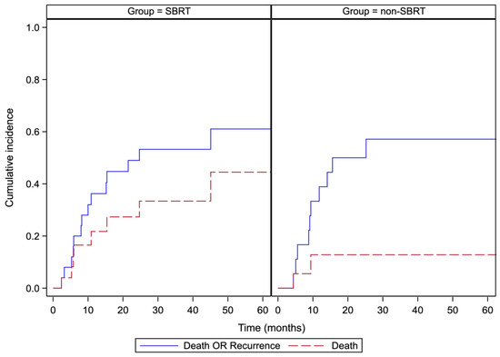 In the non-SBRT group, 44% experienced disease recurrence and 33% died from all causes. In contrast, only 24% of the SBRT group experienced disease recurrence; however, 52% were deceased from all causes.